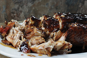 Oven directions: Preheat your oven to 350 F. Following the recipe and directions above, place the ingredients into a covered roasting pan or Dutch oven. Bake, covered, in the preheated oven for approximately 90 minutes to 2 hours, or until the pork shreds easily with a fork. Follow the directions for glazing the pork shown above.